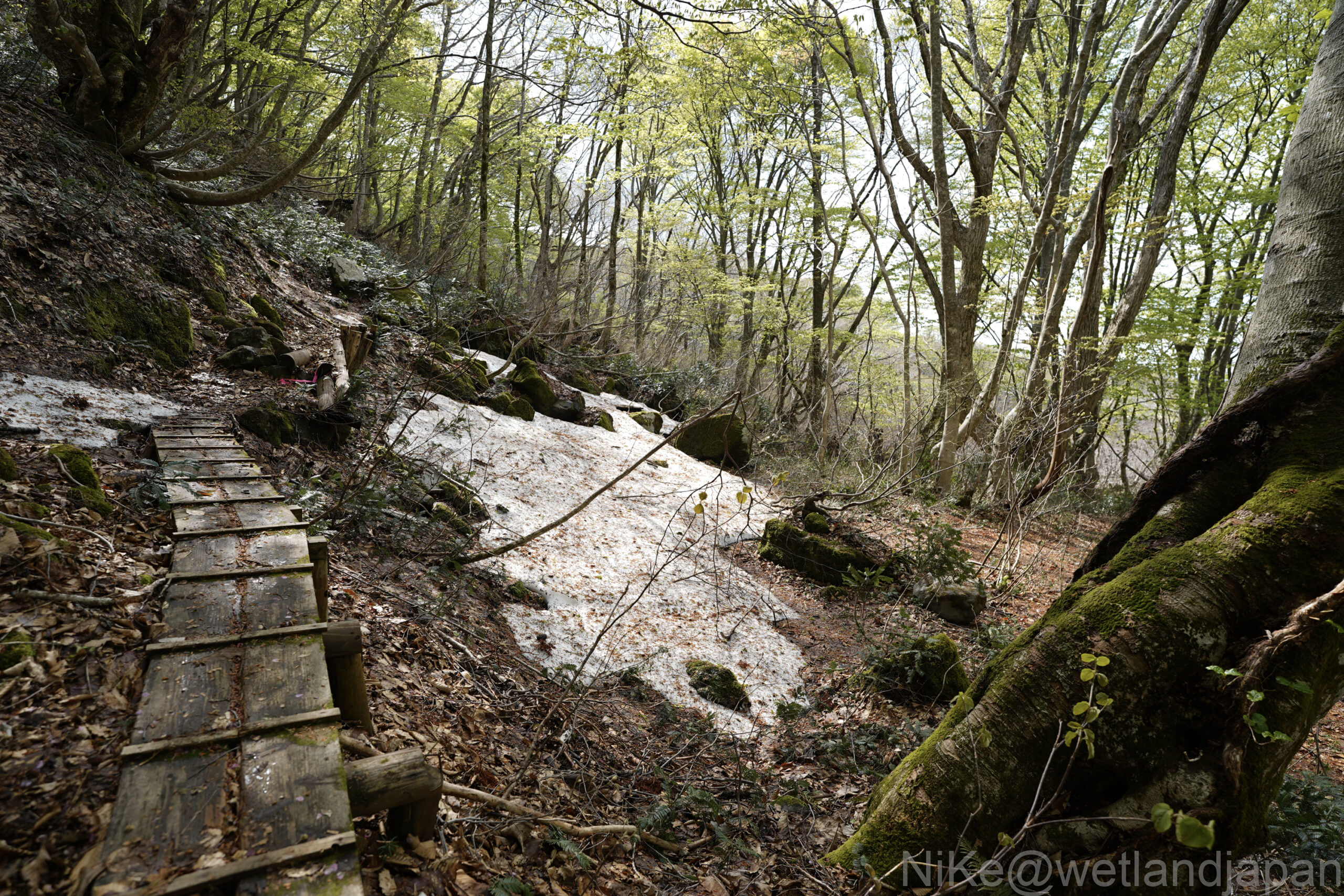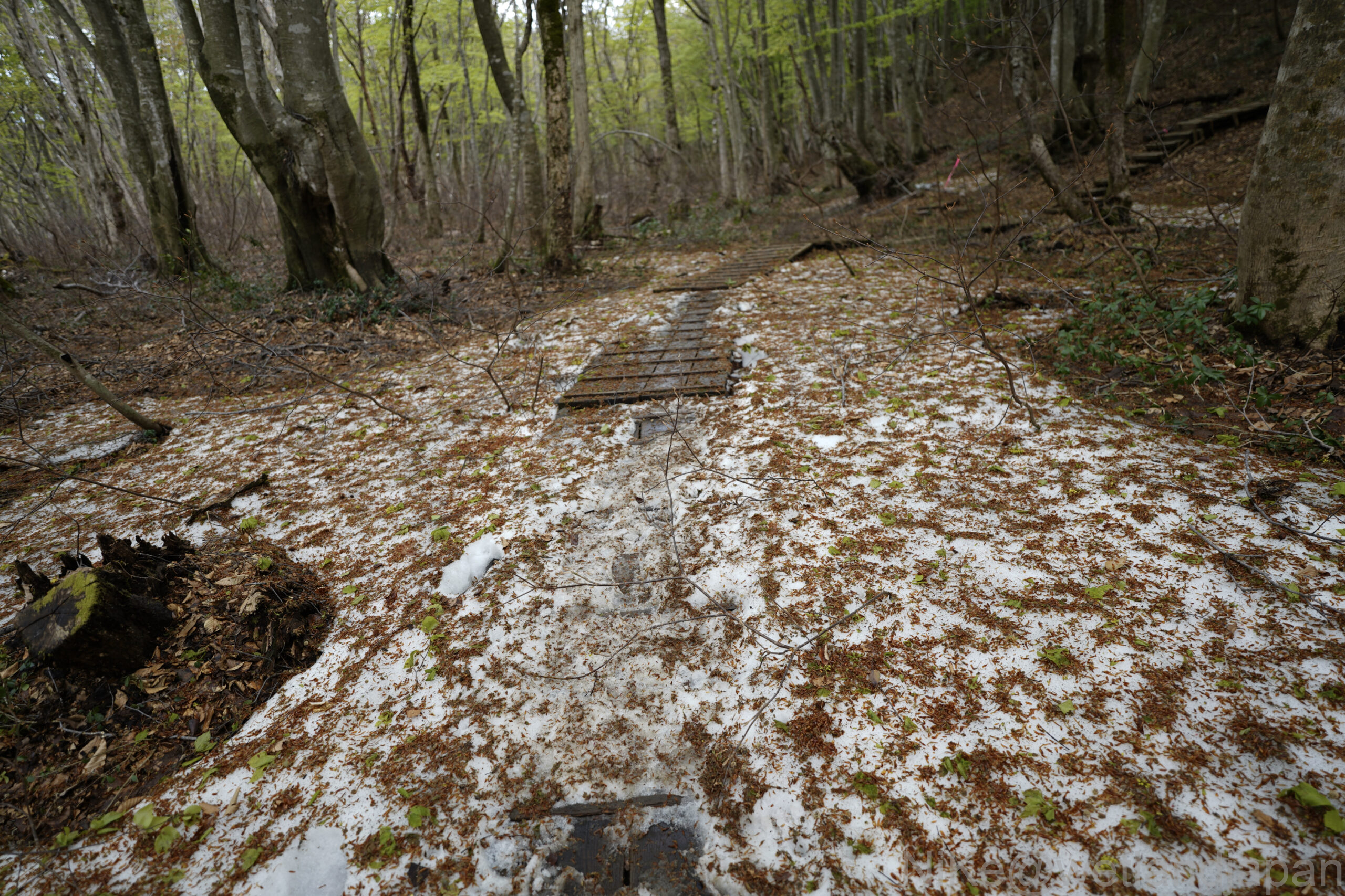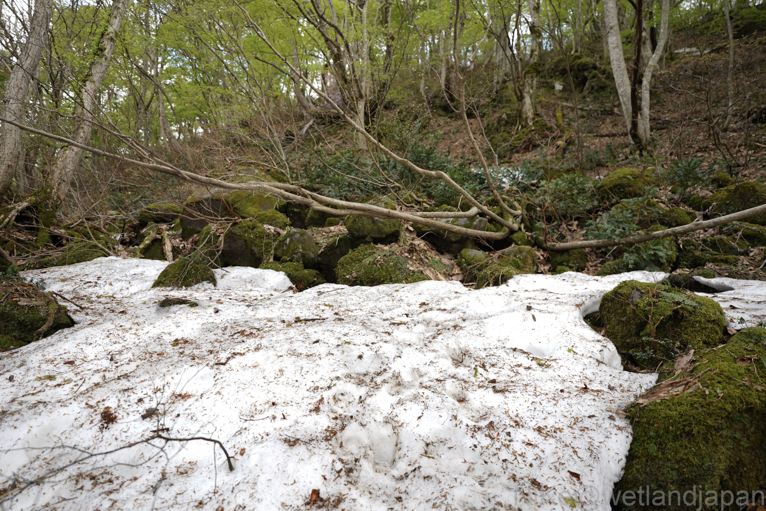 さらに進むと、ついに残雪が道を埋め尽くす。