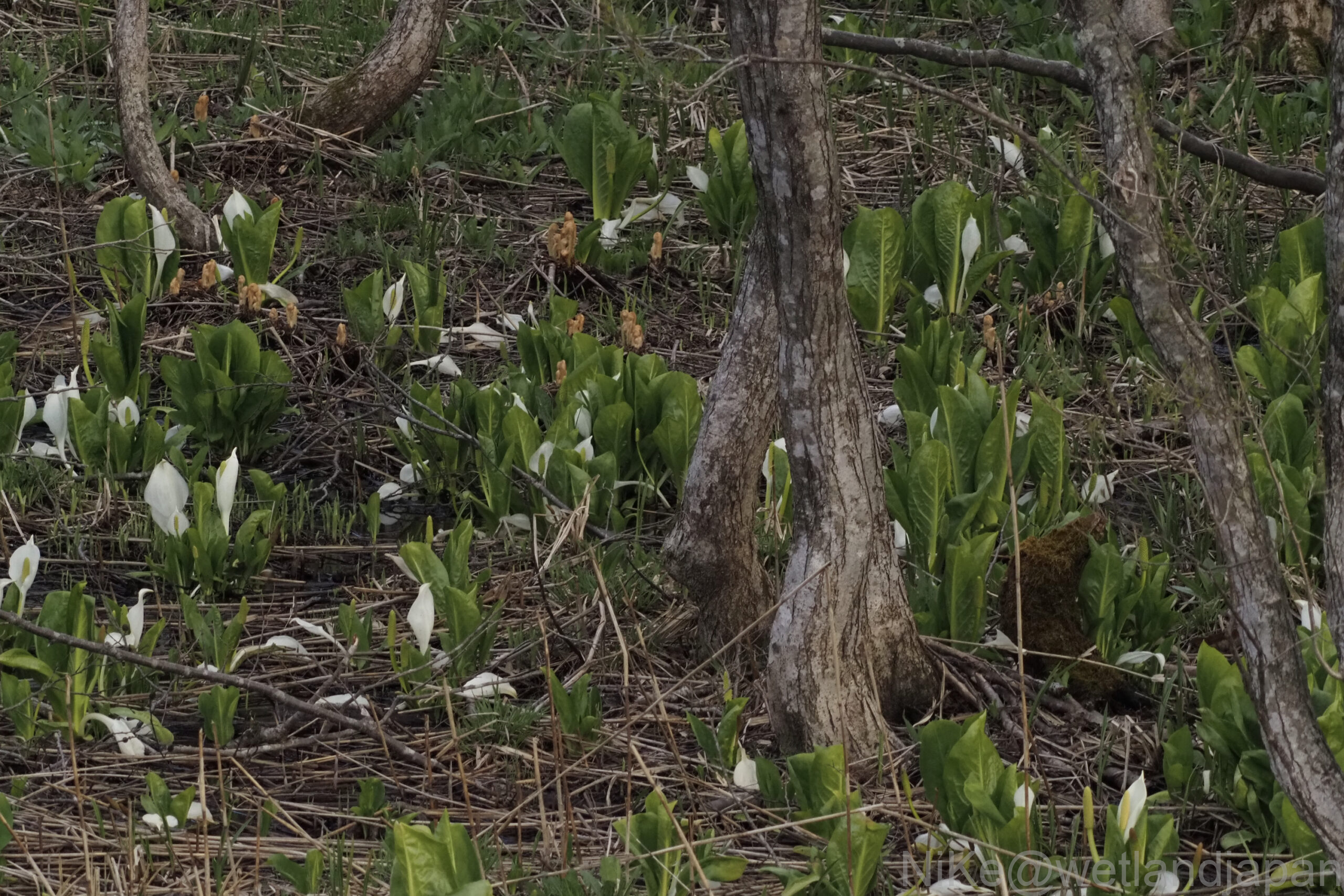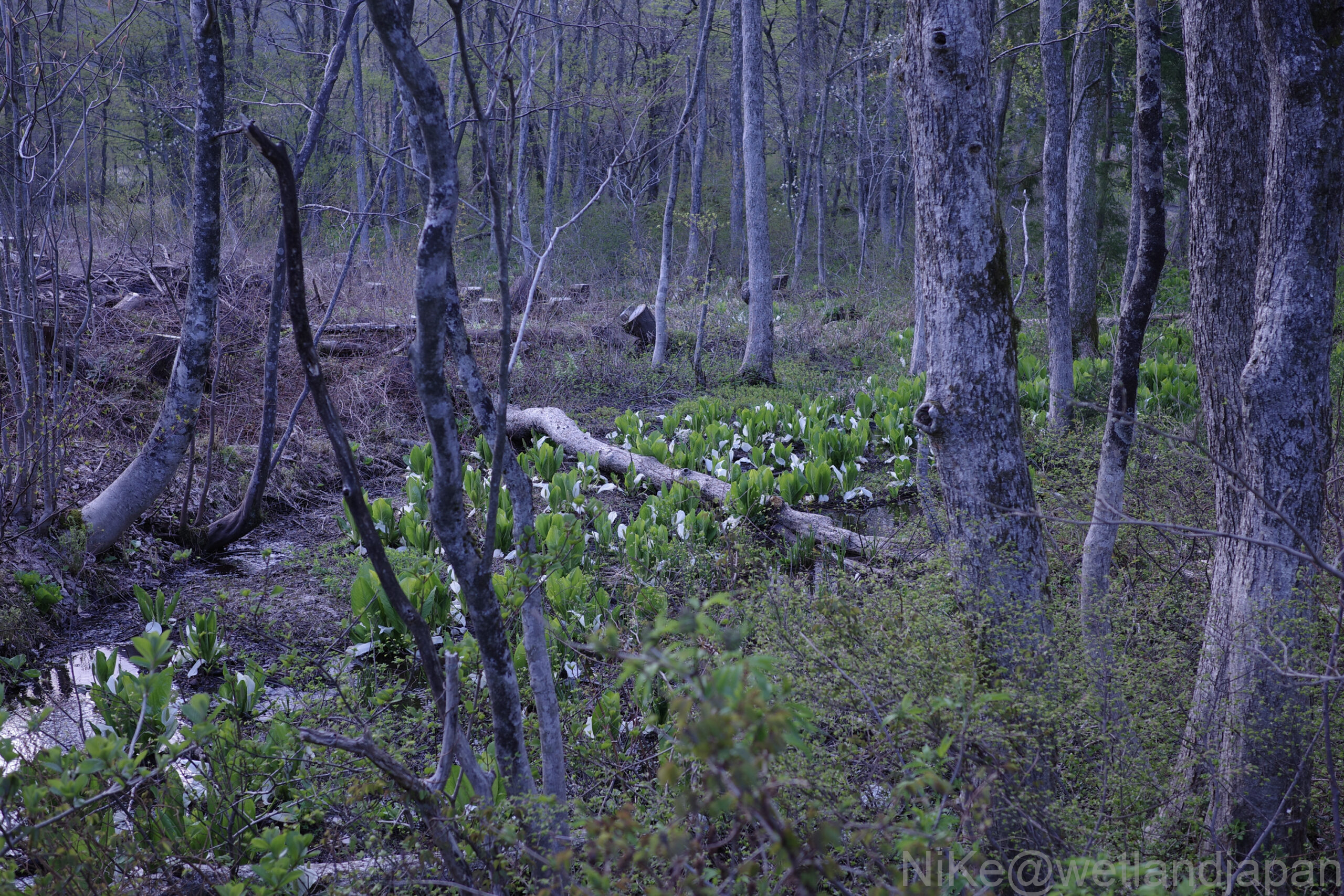ミズバショウは、木々の下に生えていることが多く、こちら側では見かけない。